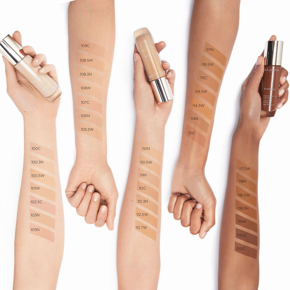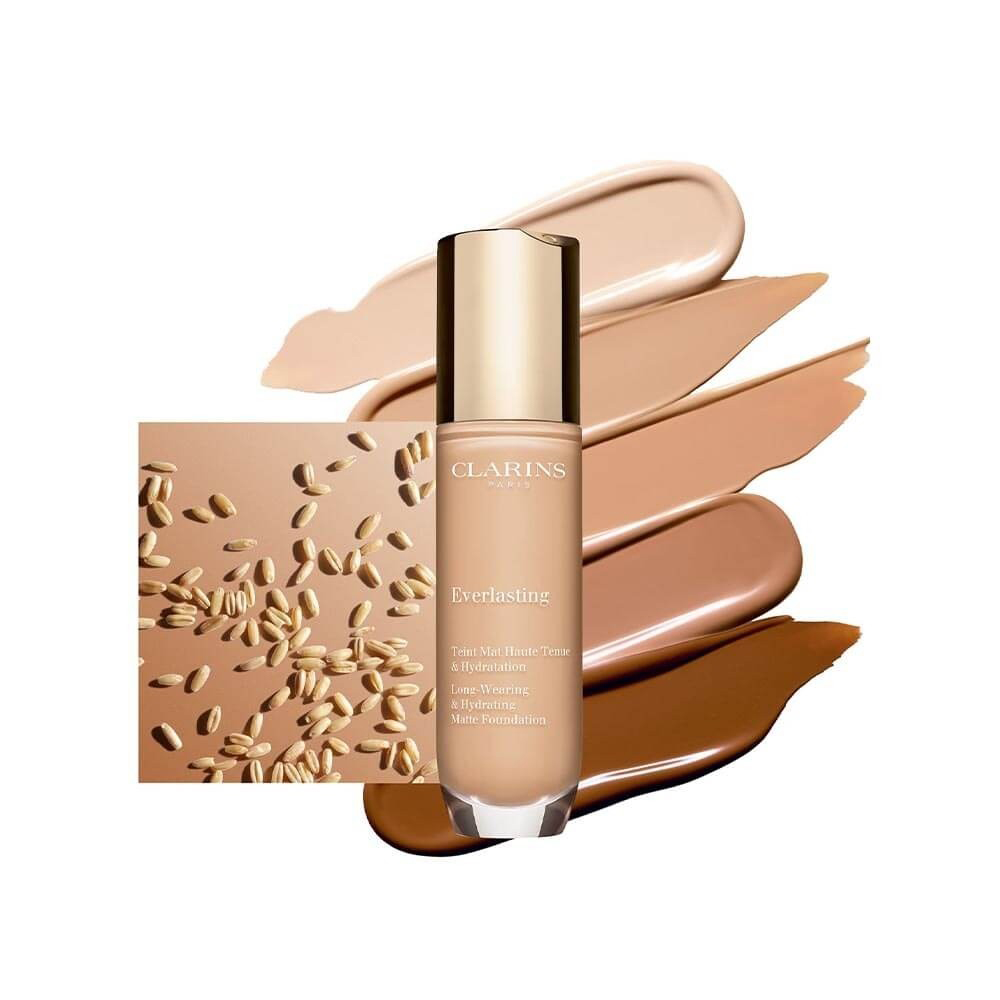 - کرم پودر Everlasting کلارنس: یکی از پرفروش ترین محصولات آرایشی کلارنس این کرم پودر با پخش و ماندگاری بالا، ظاهری مات و بافتی سبک است. در تولید این محصول از پودر مات کننده بامبو و عصاره ارگانیک کینوآ استفاده شده است که باعث آبرسانی، افزایش لطافت پوست و حفاظت از پوست در برابر آسیب های محیطی می شود.