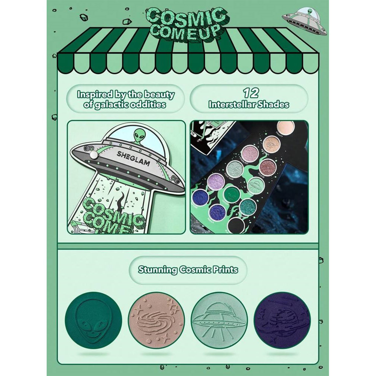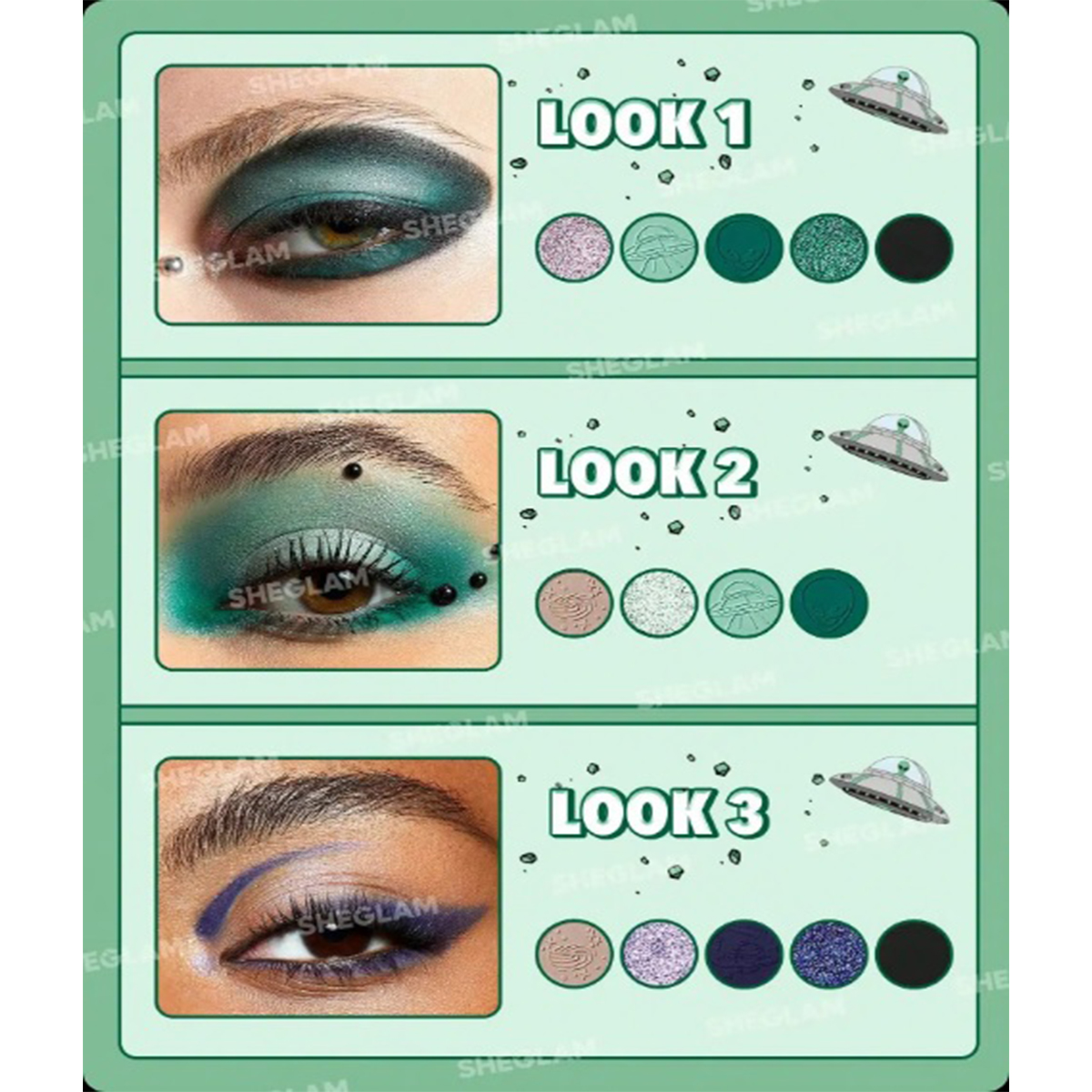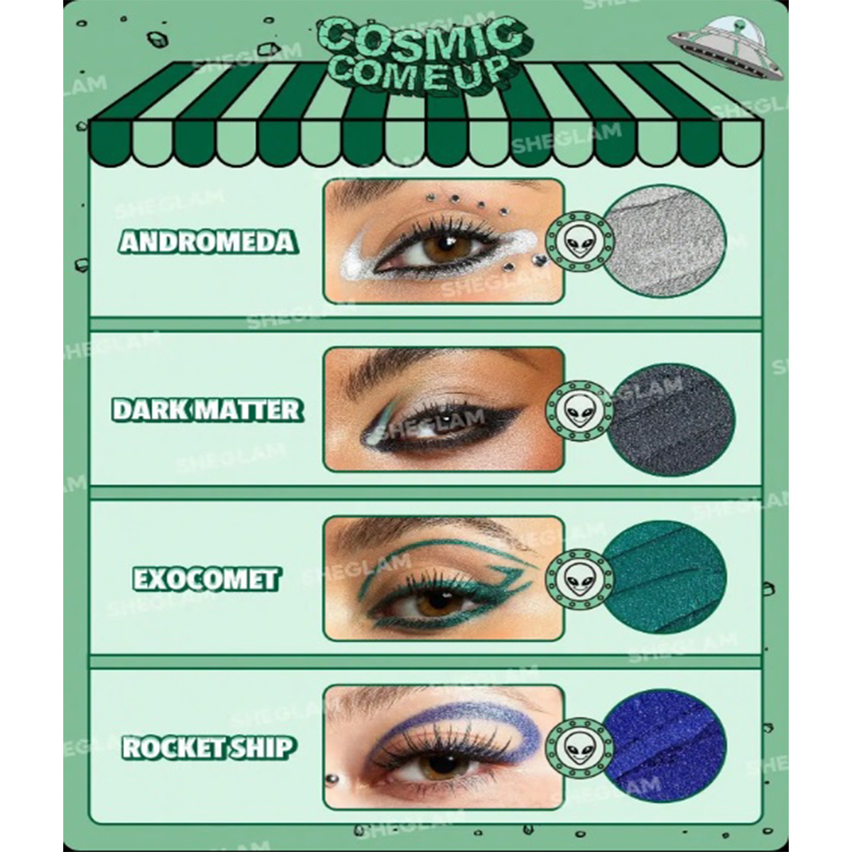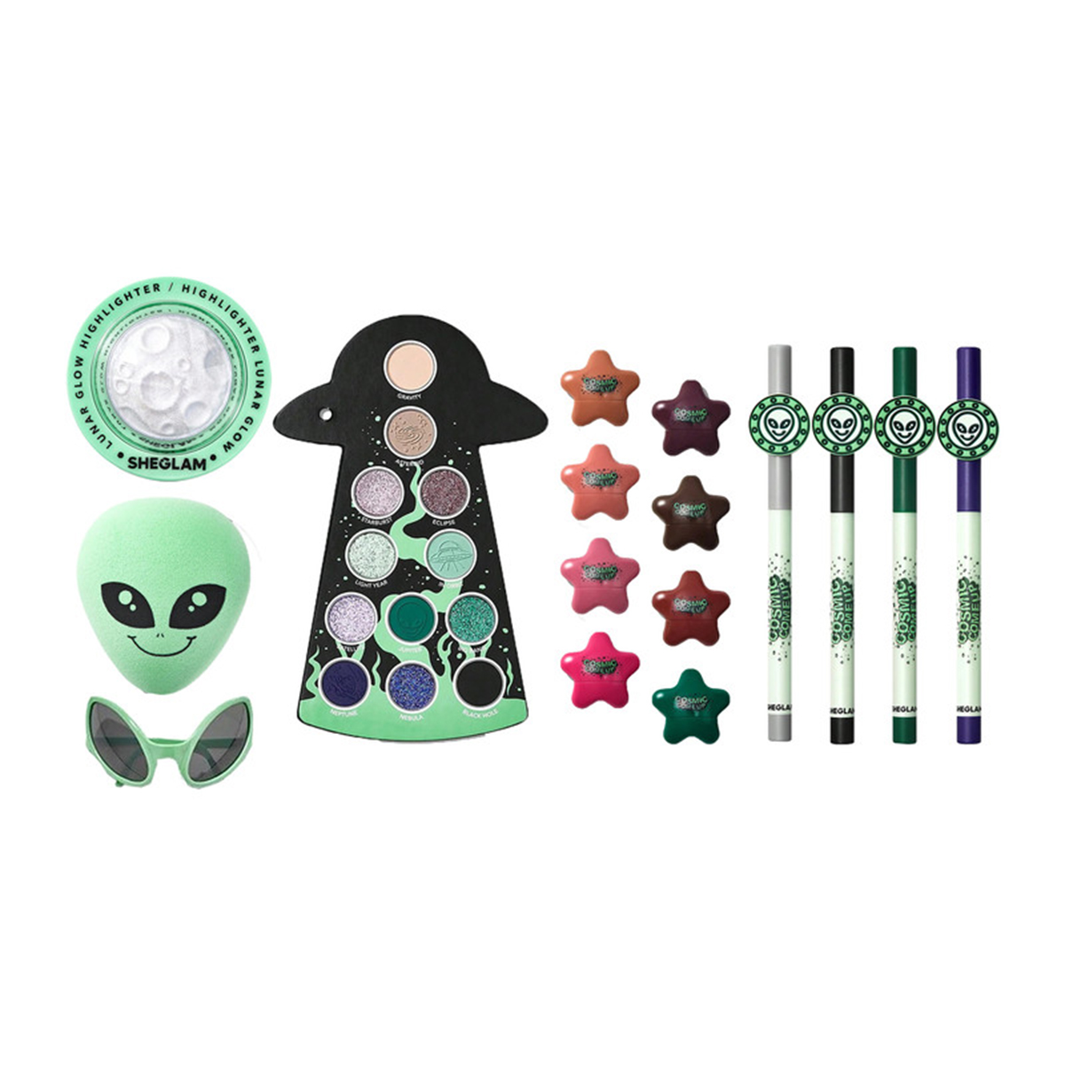 پک آرایشی فضایی شیگلم که شامل همه چیزهای عجیب و غریب، موجودات فضایی آزاد و ناسازگار است و برای رسیدن به کیهانی نهایی، آرایش کهکشانی الهام گرفته از بیگانگان خارج از این جهان طراحی شده است این مجموعه دارای یک پالت سایه چشم 12 تایی پررنگ، چهار خط چشم درخشان، دو مجموعه مینی رژ لب، یک هایلایتر درخشان و فوق العاده براق و در نهایت یک اسفنج زیبا به شکل بیگانگان و فضایی ها است که به زیبایی ظاهر و آرایش کمک می کند. با استفاده از محصولات این پک آرایشی به تنهایی یا به عنوان مکمل در مجموعه آرایش خود ، میتوانید کهکشان خود را انتخاب کنید و وارد دنیای خود شوید.