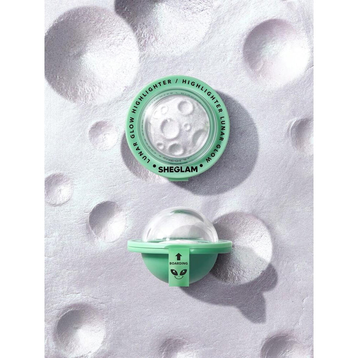 هایلایتر این پک آرایش Sheglam همانند یک بشقاب پرنده فوق العاده زیبا است که درخشش کهکشانی به میکاپ میدهد این درخشش منحصر به فرد بازتابنده رنگ آبی سبز می باشد و احساس سفر در کهکشان ها را به شما می بخشد. می توانید از این درخشش روی صورت خود در جایی که می خواهید مانند چشم ها، بینی و گونه ها بزنید و پوست خود را براق و درخشان کنید و از آن لذت ببرید .
