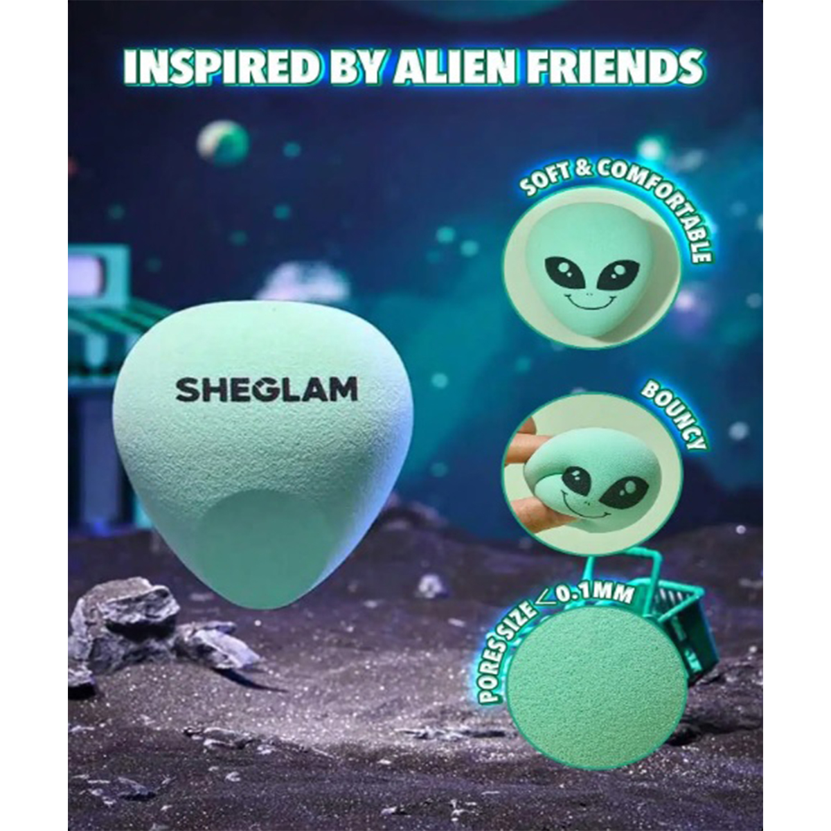 همچنین این پک آرایشی فضایی شیگلم دارای یک پد آرایش سبز رنگ می باشد که این اسفنج زیبا به طور ویژه توسط دوستان بیگانه سبز طراحی شده است. این پد دوست داشتنی و زیبا به ظاهر فضایی ها با بافت بسیار نرم و با کیفیت می باشد که به راحتی می توان از آن برای همه قسمت های صورت استفاده کرد. این پد فضایی پوشش کامل و یکدست برای صورت به وجود می آورد.